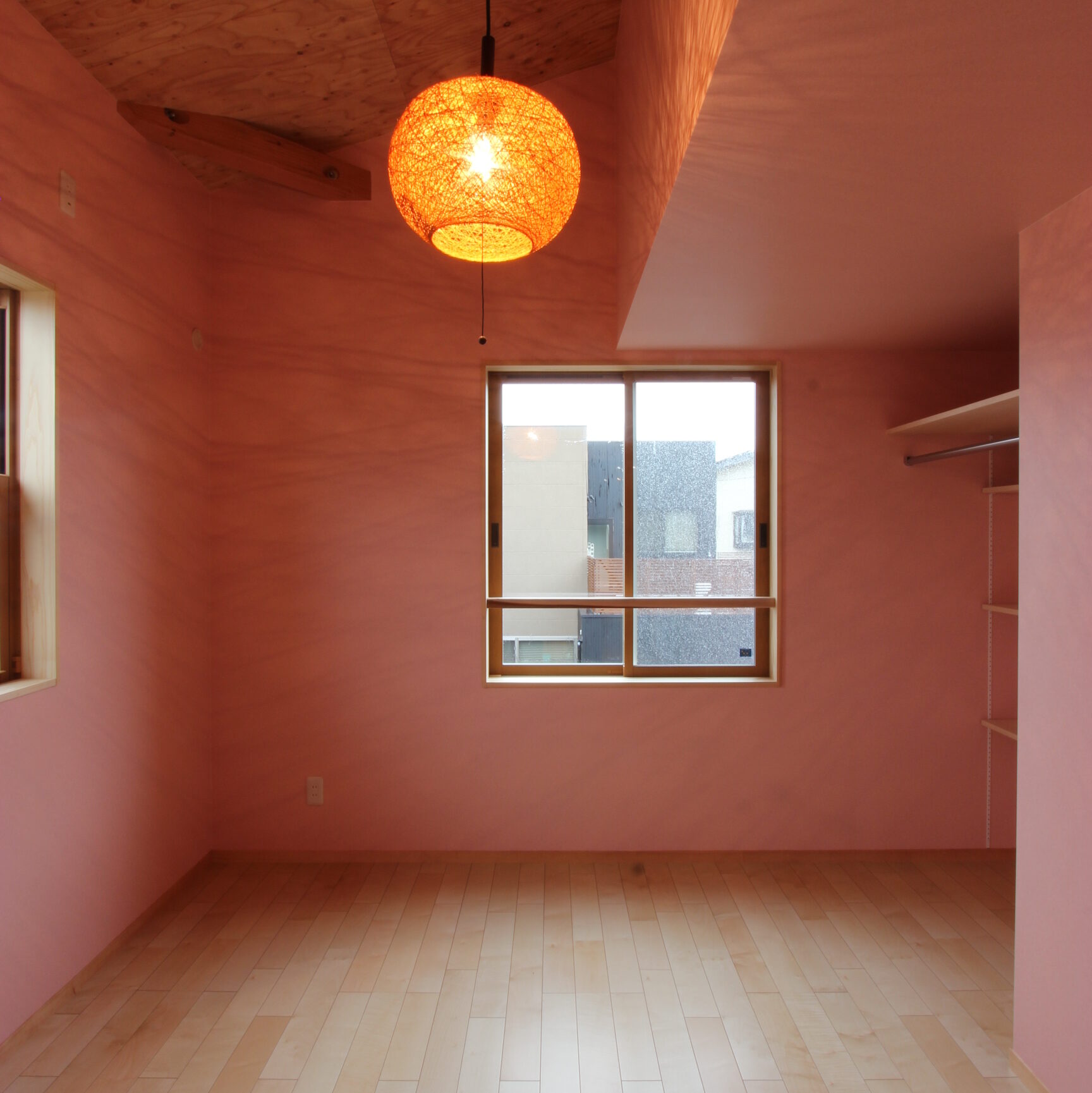 4,女の子の部屋。マットピンクと自然素材のライト。