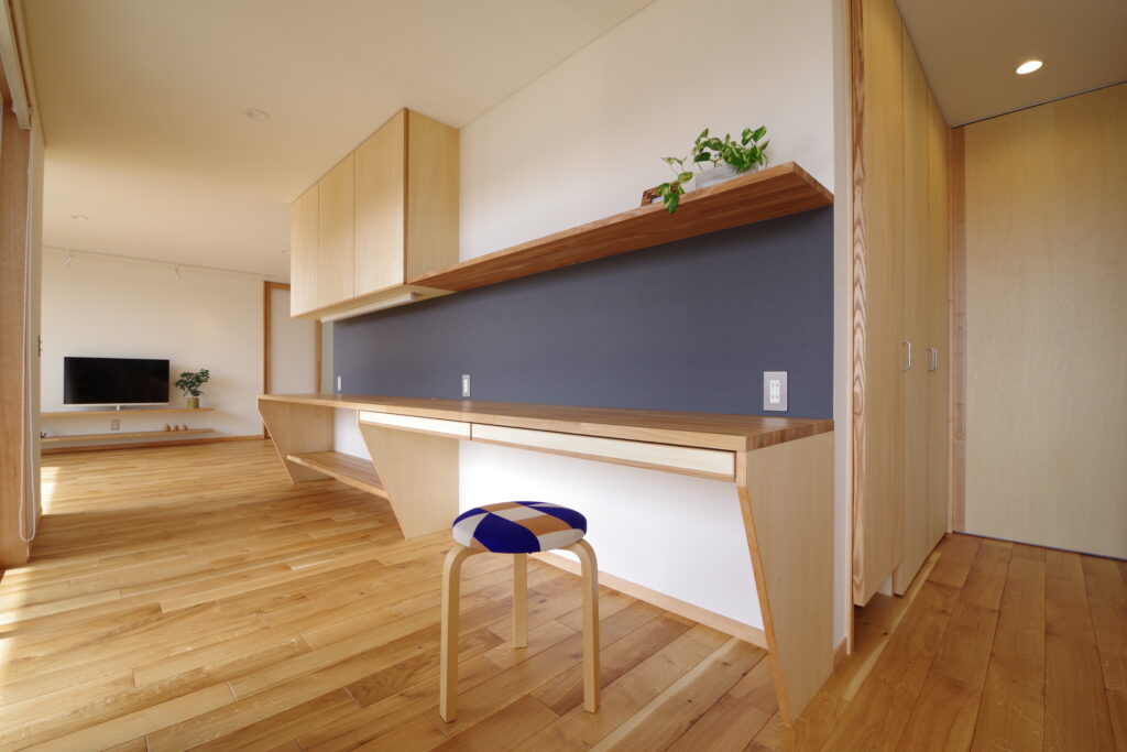 ↑また子供部屋がまったく個々に設けられないご家族もいらっしゃいますが、各自ちょっとしたスペースで自分時間を楽しむようにすることもできます。個々に設けられなくても、ワークスペースや部屋の一部をプライベート空間にして、「居場所」をつくりやすいように設計段階で考えることもできます。