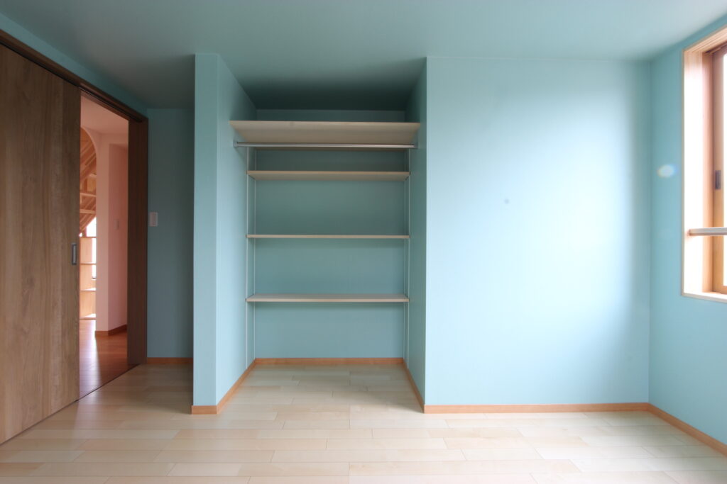 3,男の子の部屋。洋服を収納するスペースもデッドスペースが生まれないように、可動棚を取り付けて。色も落ち着いたミントブルー。