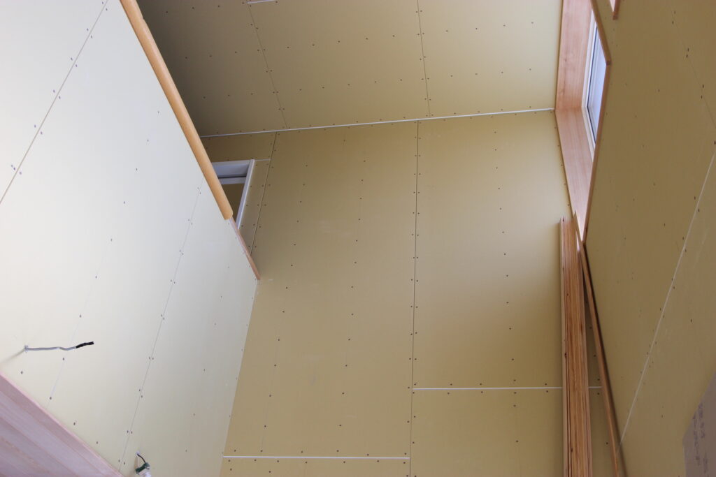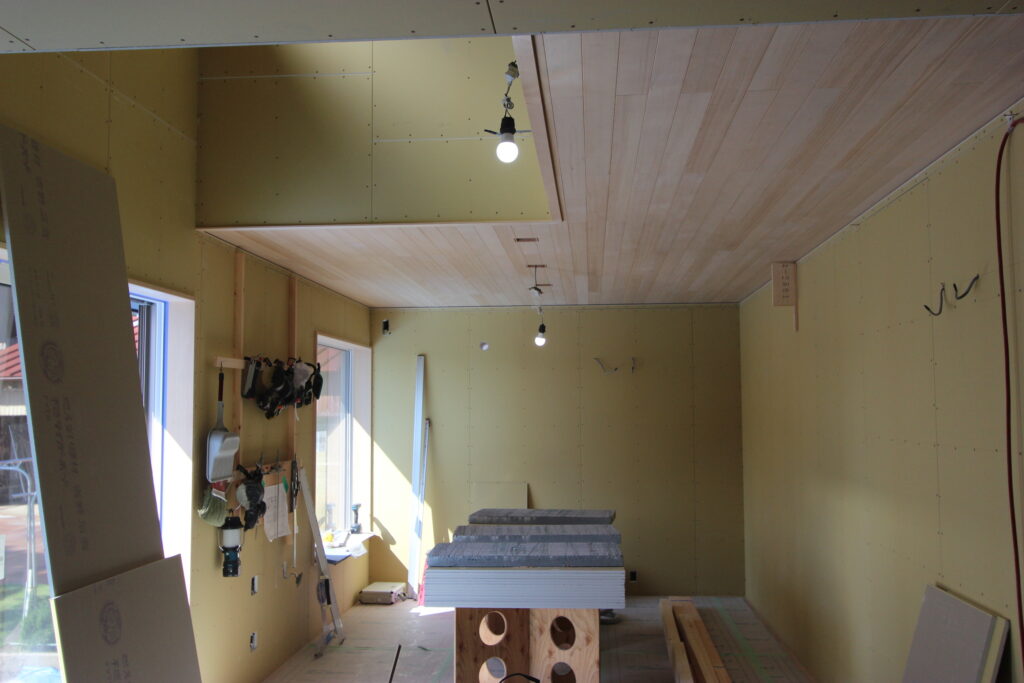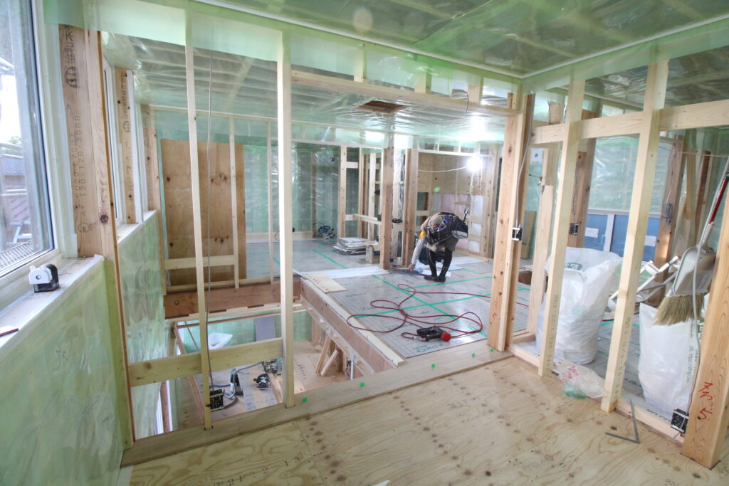 室内はセルロースファイバー吹込み~気密シート~ボード張り~木工事と進みます。