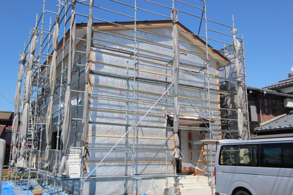上棟後の様子~通気胴縁~外壁はガルバリウムスパンドレル。