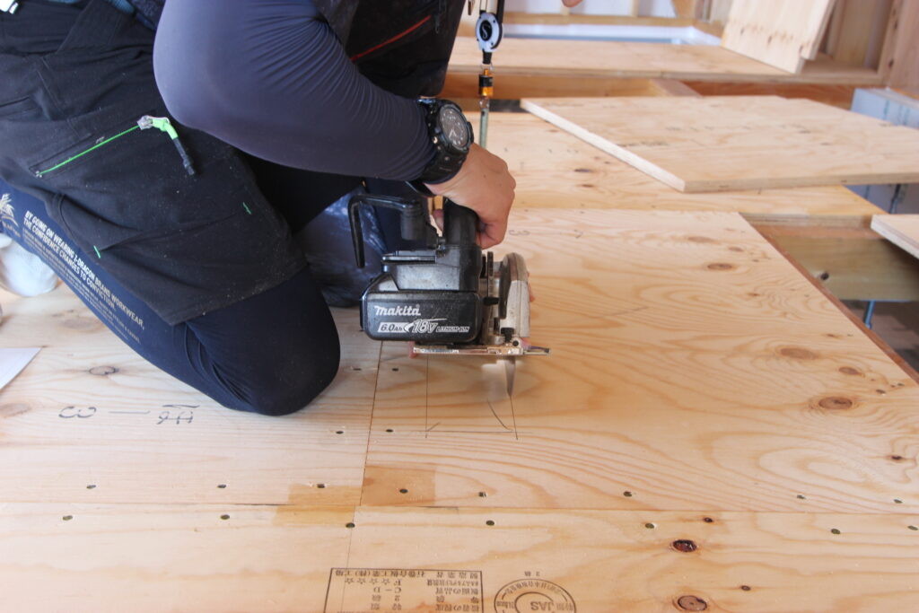 床下エアコンは、床下に設置したエアコンから温風を基礎内に送り込み、床面のガラリを通じて室内に広げる仕組みです。ガラリを設置する部分を大工があらかじめ加工します。