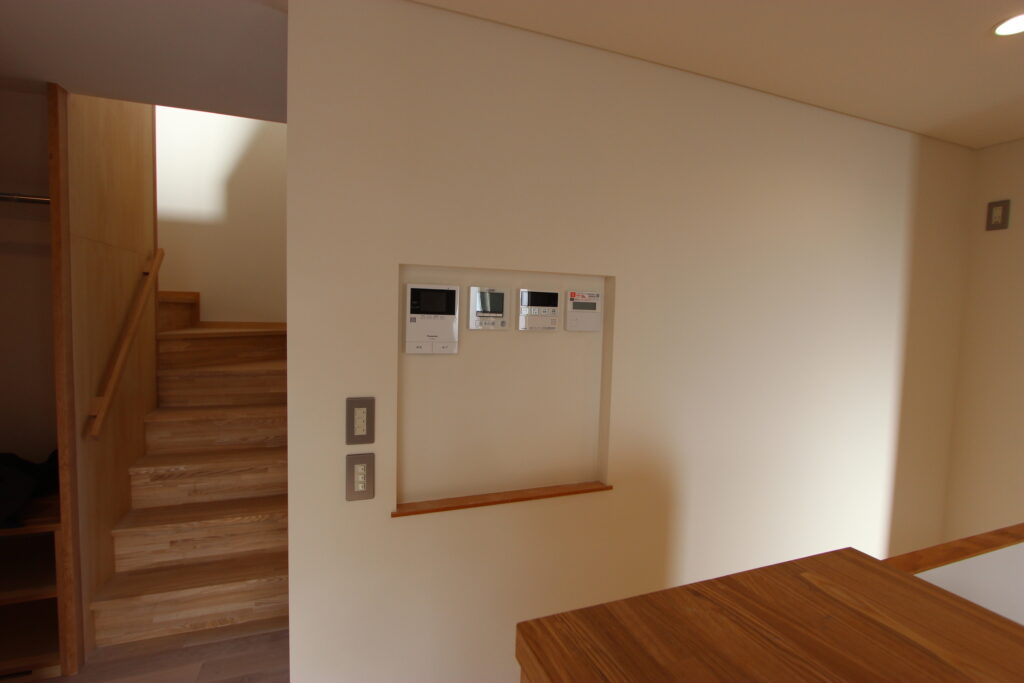 リビングにニッチを設け、床下エアコンや換気システム、インターフォンなどをまとめて配置しました。