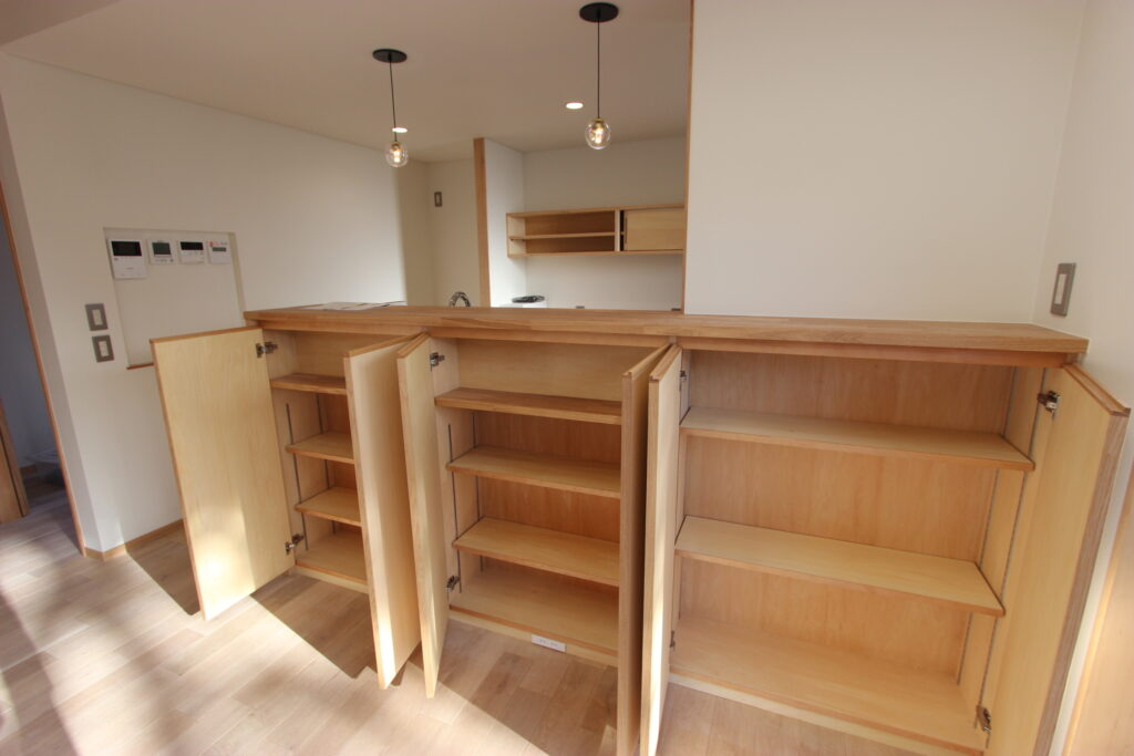 キッチンの造作収納もきれいに仕上げられています。対面キッチンの立ち上がりを高くすることで、手元が見えにくく、すっきりとみえます。