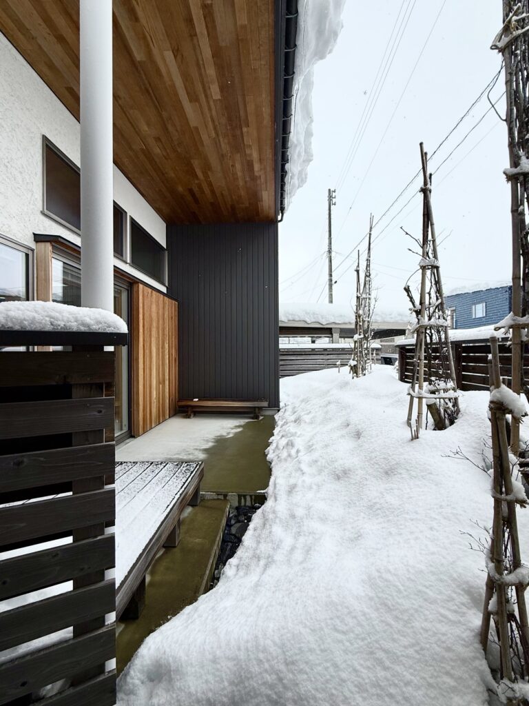 庭にも雪が溢れています。深い軒の出に守られた土間テラスは真冬でも活躍しそうです。家が十分にあたたかいので子供なら真冬でも庭で楽しく遊ぶかも?と感じます。