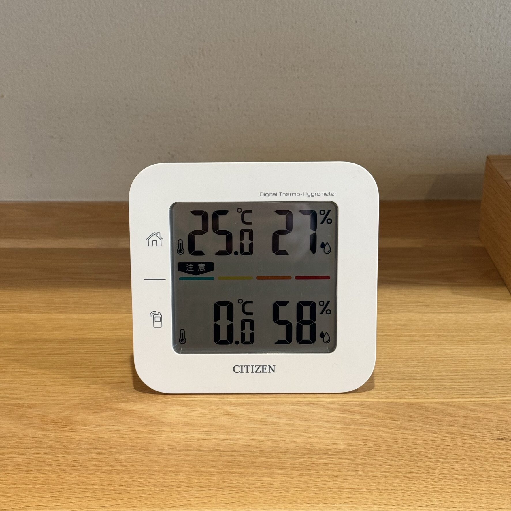 生活していない住まいですので、湿気を出す洗濯物もないせいか湿度は乾燥状態。(写真の温度表示は、上が1階LDK、下が外気温を表示しています。)