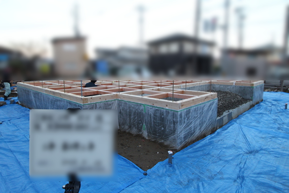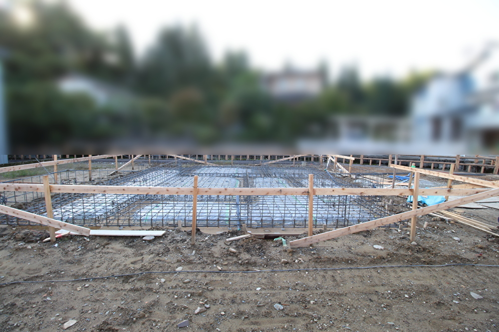 堀削 → 砕石敷き → 防湿シート敷き → 捨てコンクリート打設 → 鉄筋組立 → 配筋検査→打設