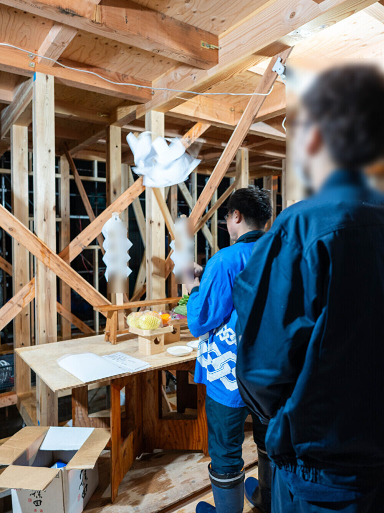 上棟一日目はあいにくの雨に見舞われましたが、大工総出で作業を進め、予定通り段取り良く完了。夕方には上棟式も行いました。